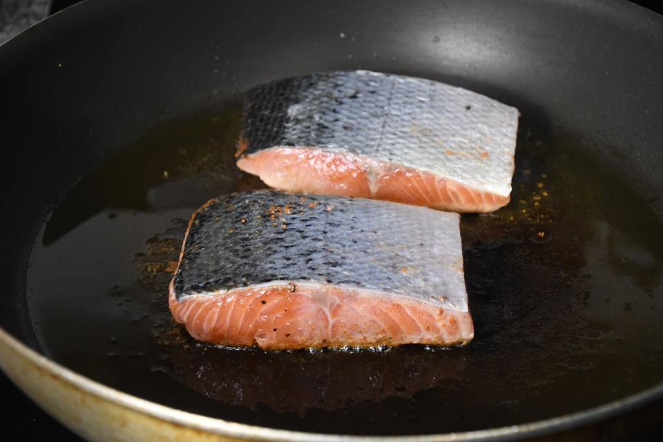 8. In the large frying pan, pan fry the flesh side of the salmon for about 5-6 minutes or until golden brown.  The skin of the salmon should be facing up.  Once the salmon is browned, turn the salmon over with the skin now facing down.  Turn the heat down.