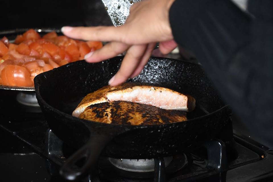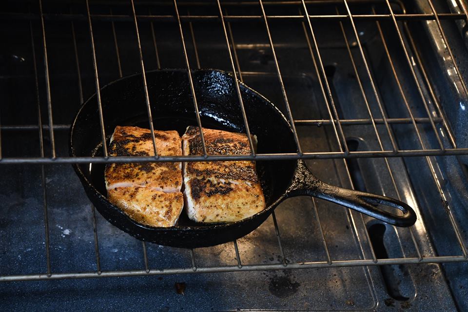 9. Baste a small caste iron skillet with olive oil.  Then place each of the salmon fillets in the skillet with the skin facing down. Cook the salmon for 10-15 minutes depending on how thick your salmon is cut.  Do not overcook the salmon.