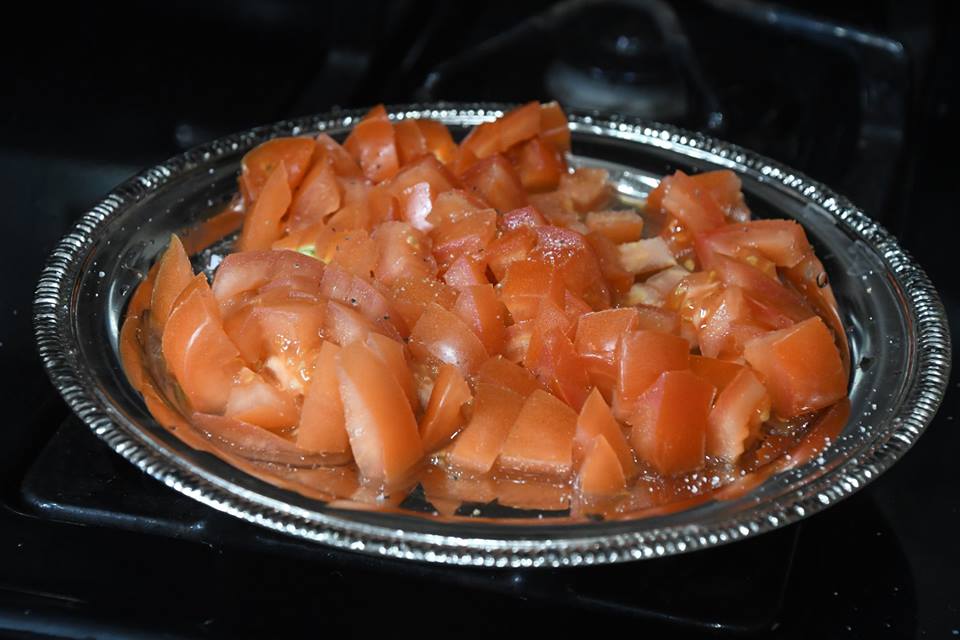 5. While the fish is marinating rinse off your spinach, chop up you garlic and tomatoes and place each of them in their own dish.